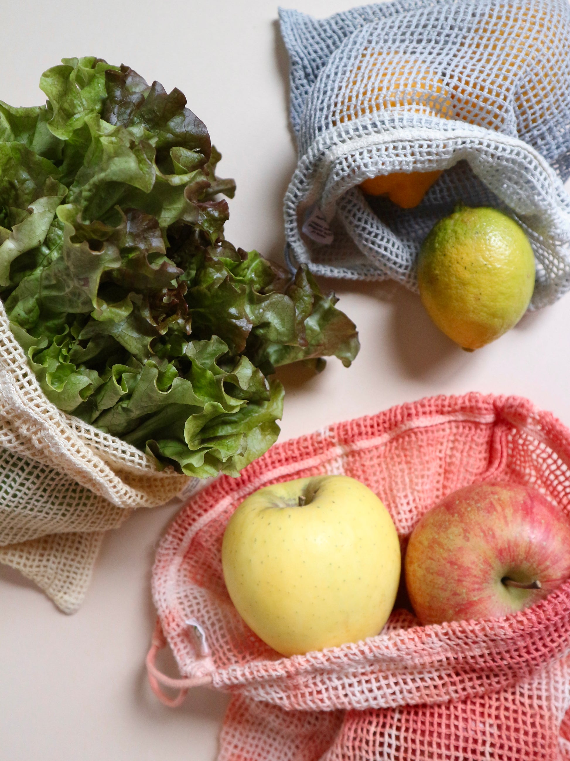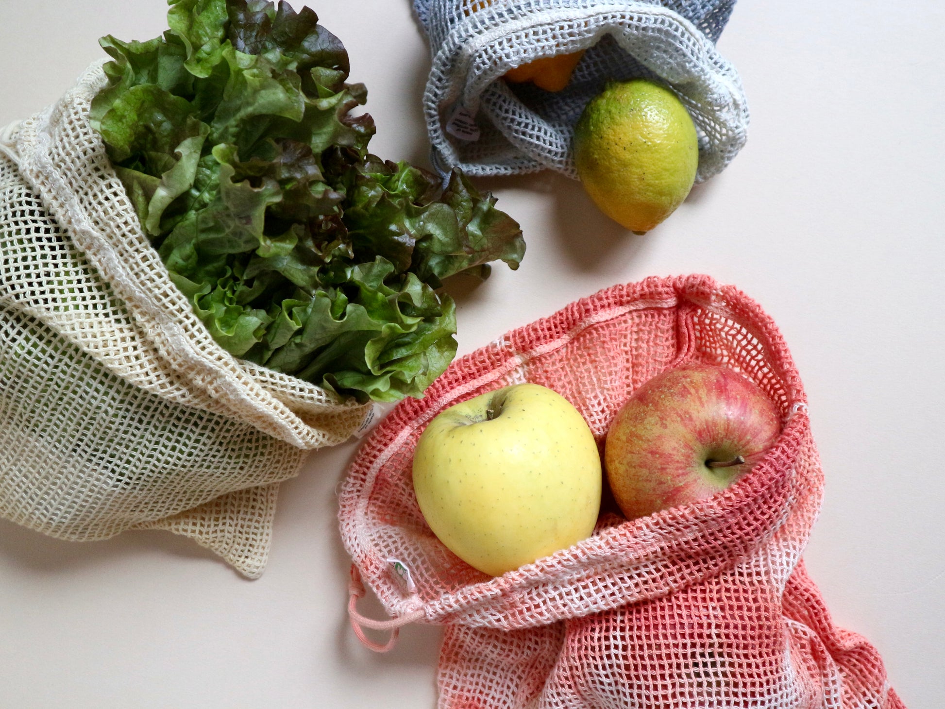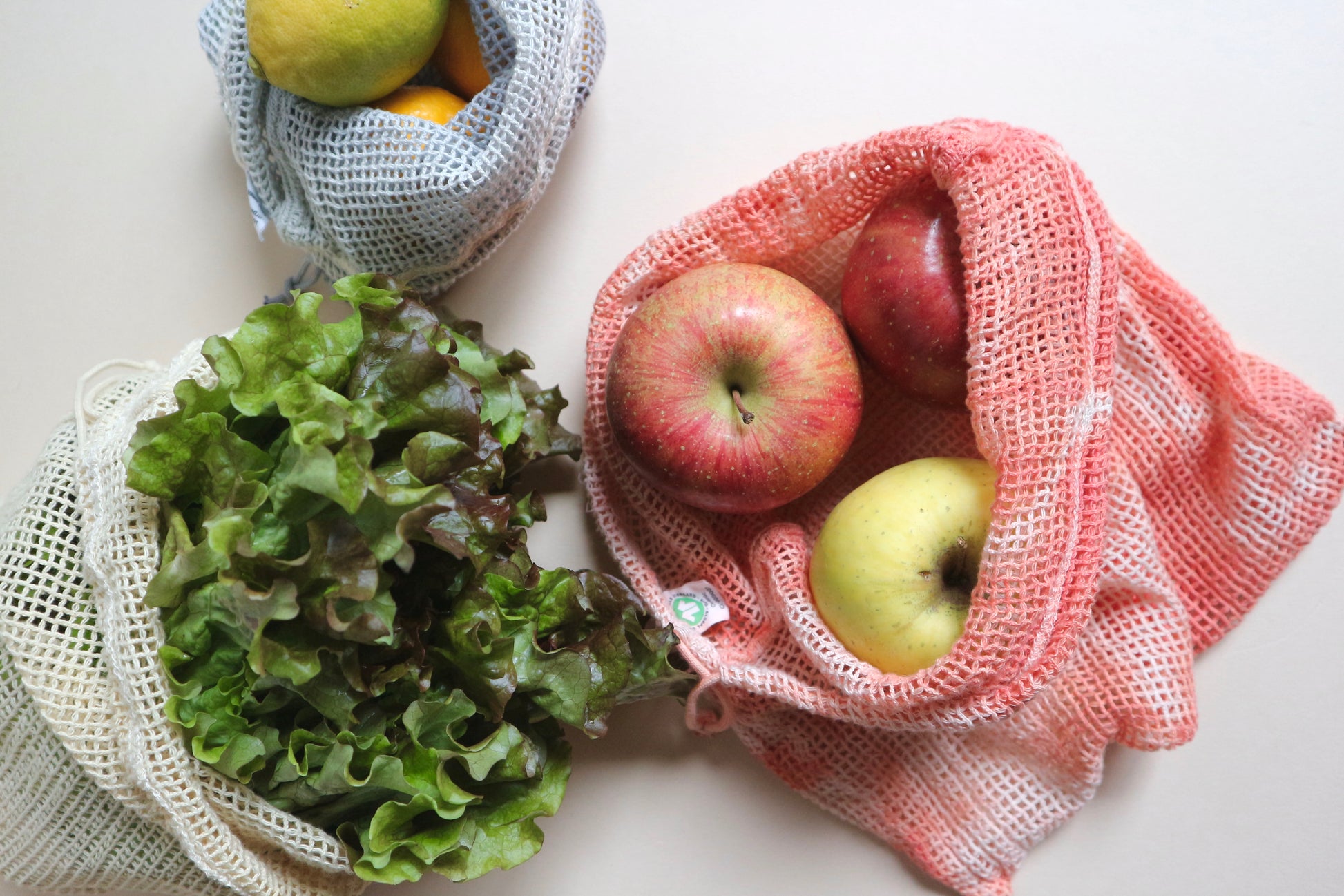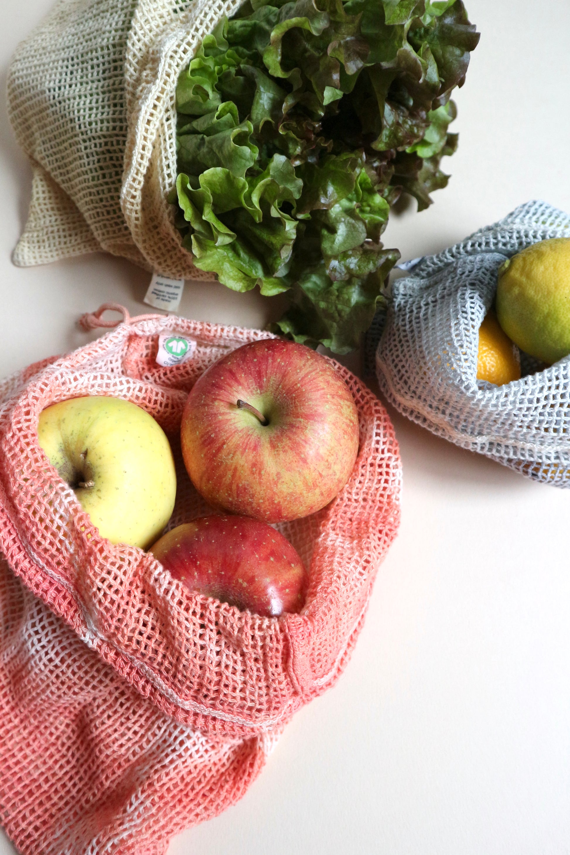 マイバッグと一緒にスーパーやマルシェに持っていき、ポリ袋の替わりに野菜を入れるインナーバッグとしてお使いいただけます。適度な伸縮性でたくさん詰め込めて、バラ売りの野菜がマイバッグの中でばらつきません。