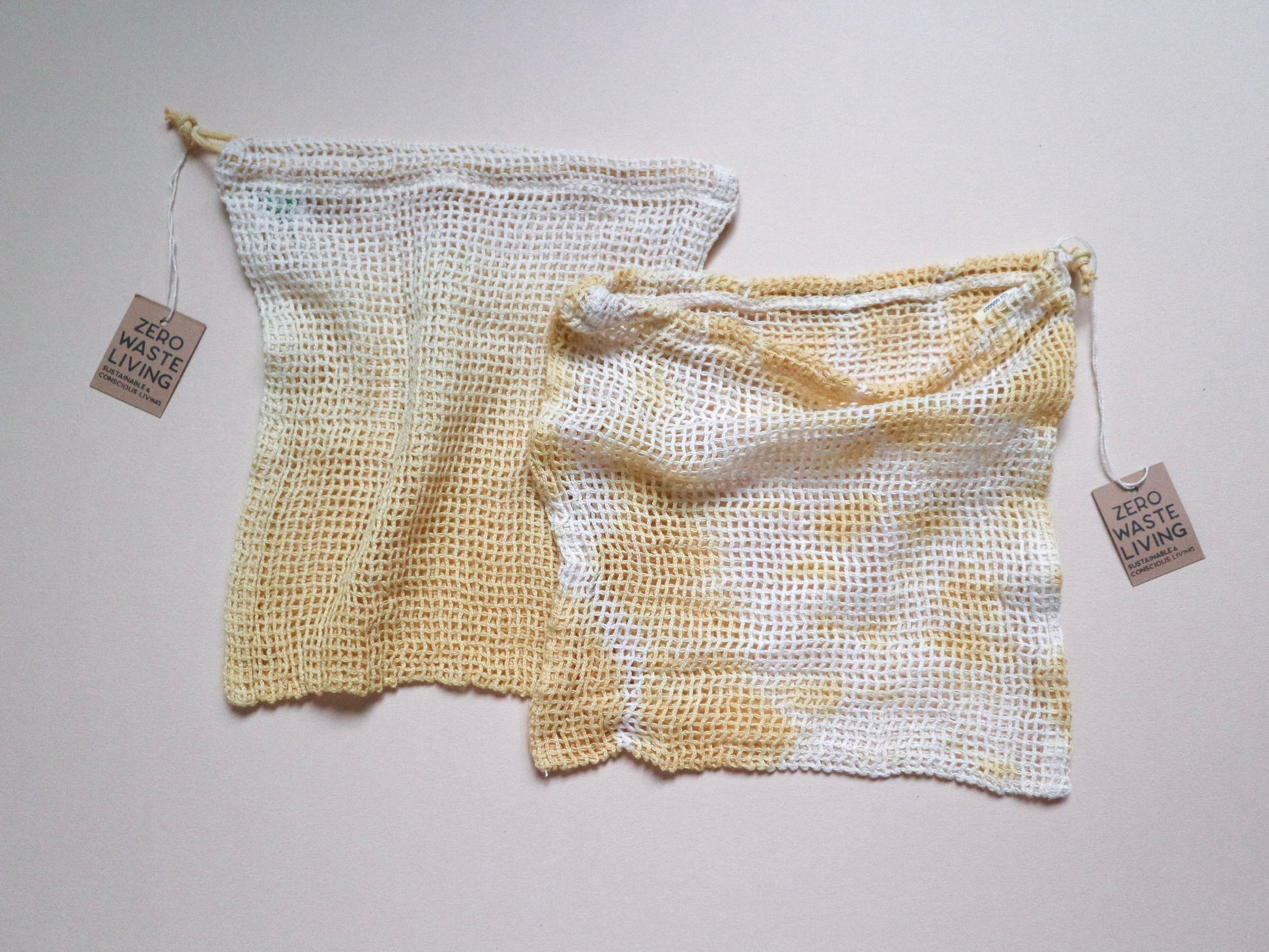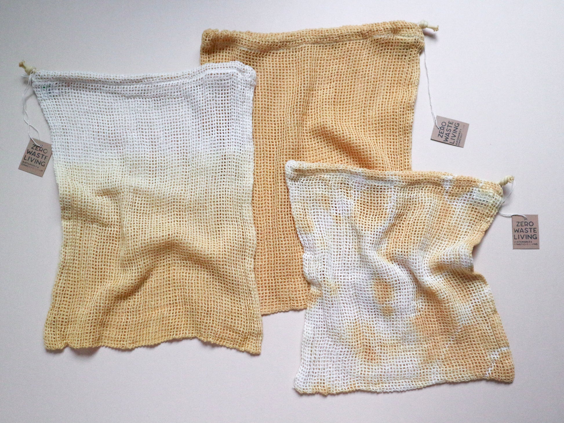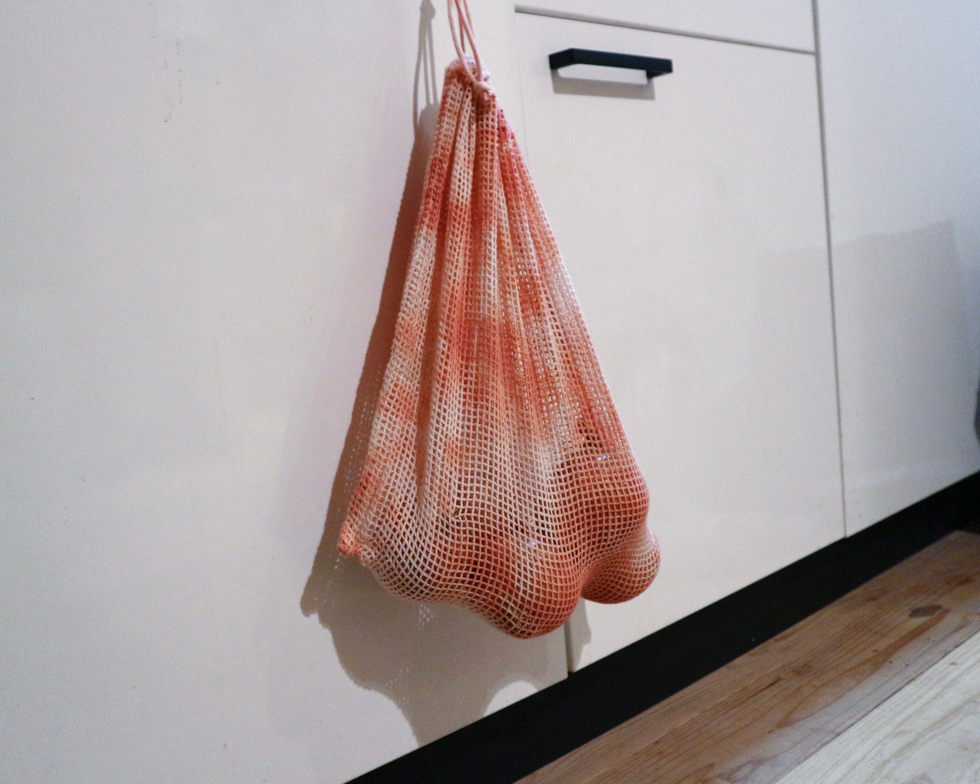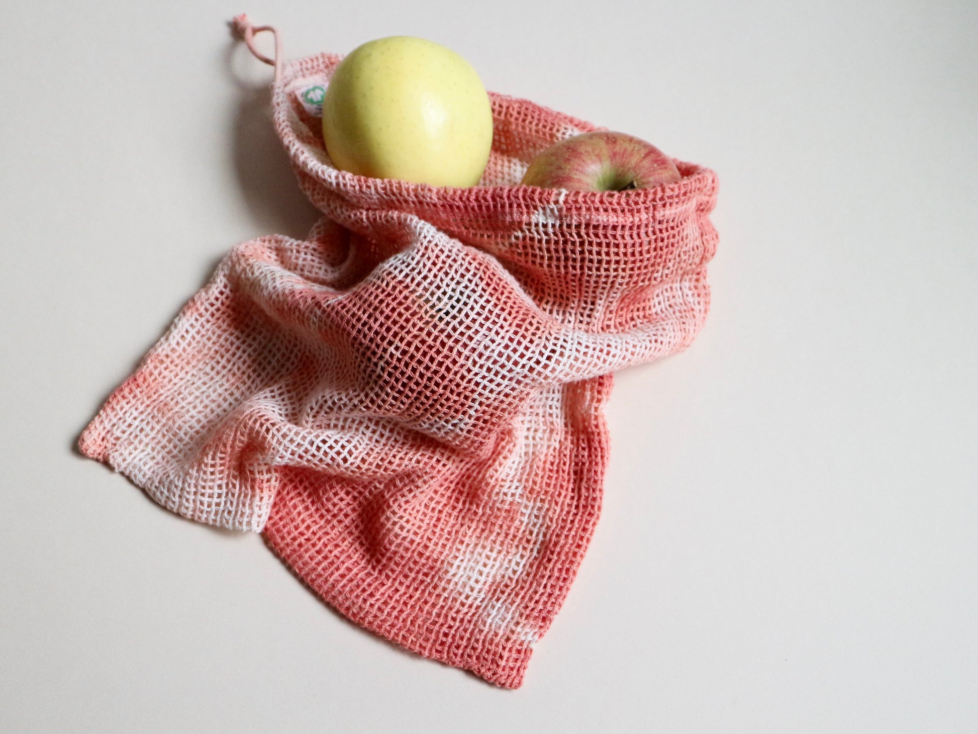 GOTS(オーガニックテキスタイル世界基準)認証のオーガニックコットン100%の野菜が長持ちするメッシュバッグに、草木染めで”大地の色合い”を染め写しました。
