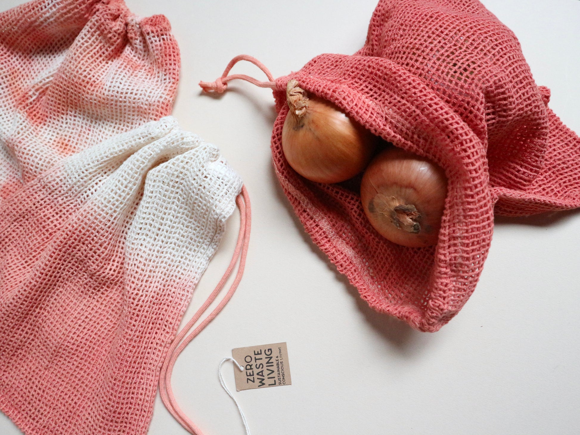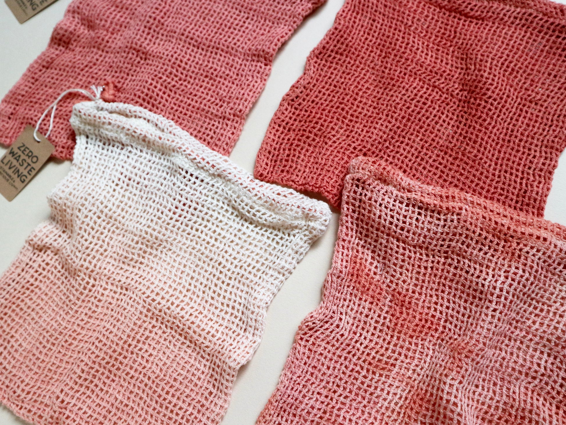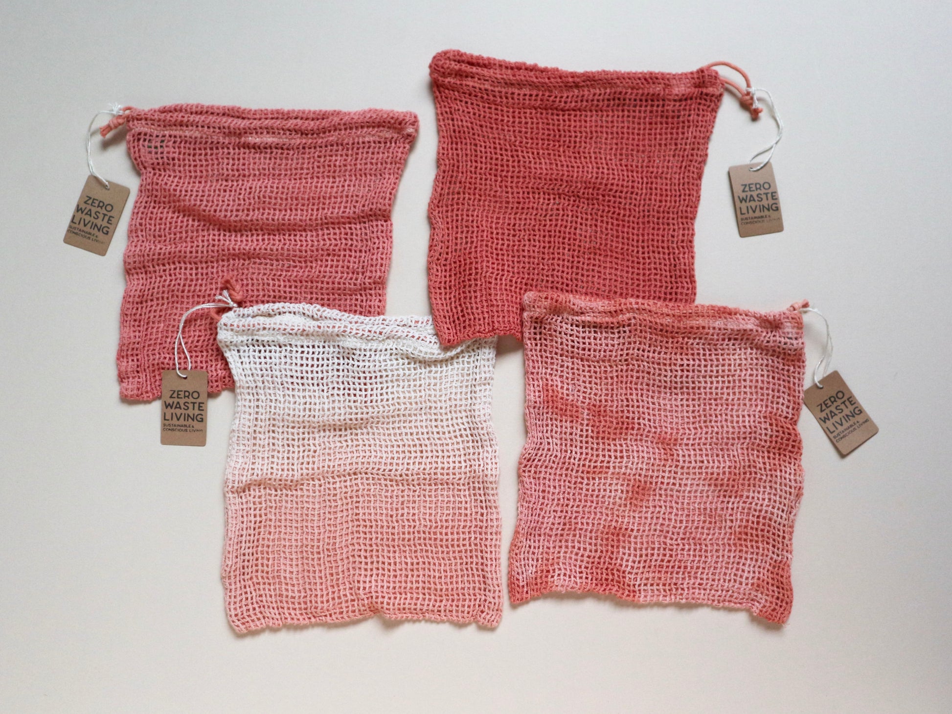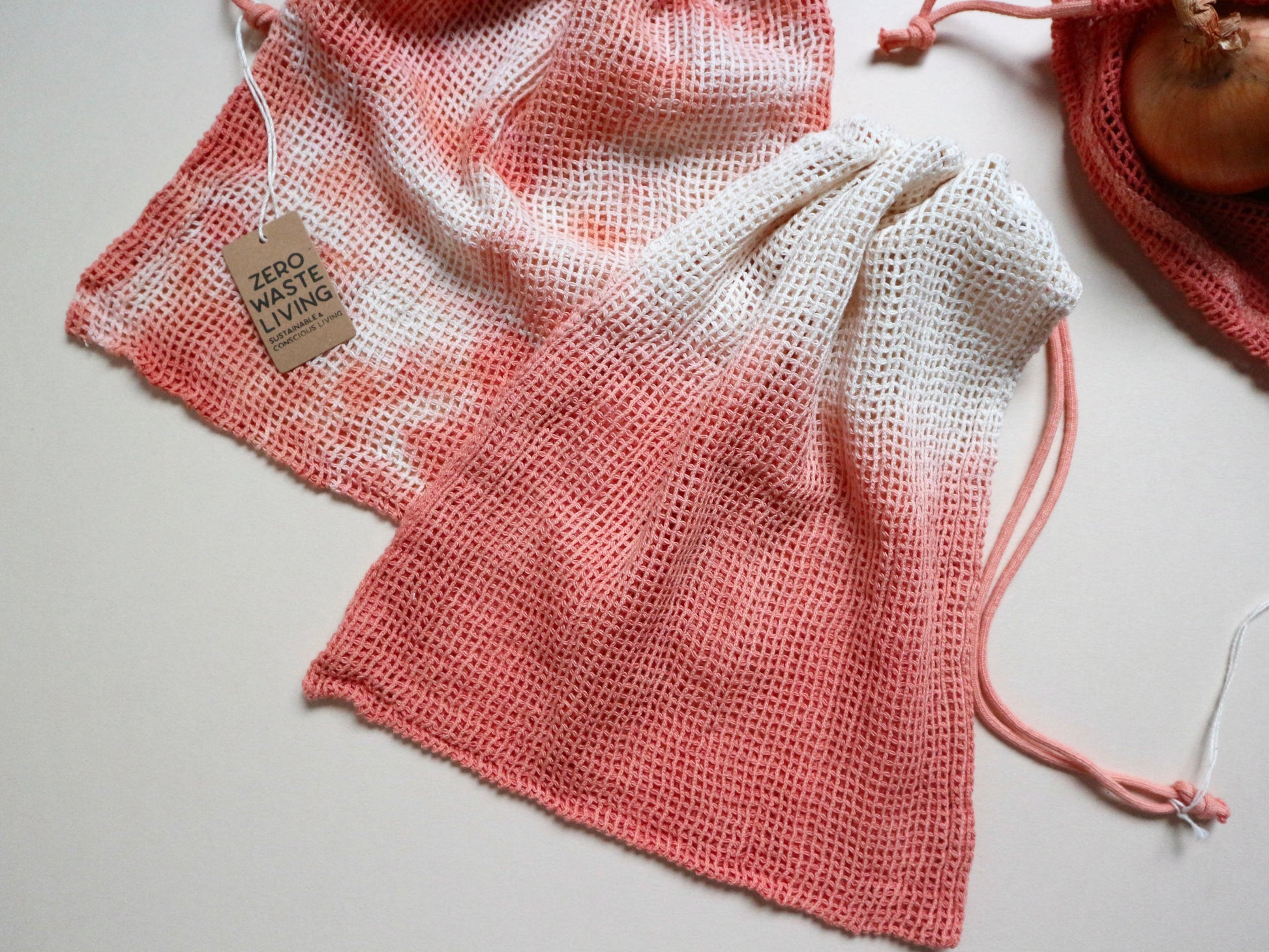 GOTS(オーガニックテキスタイル世界基準)認証のオーガニックコットン100%の野菜が長持ちするメッシュバッグに、草木染めで”大地の色合い”を染め写しました。