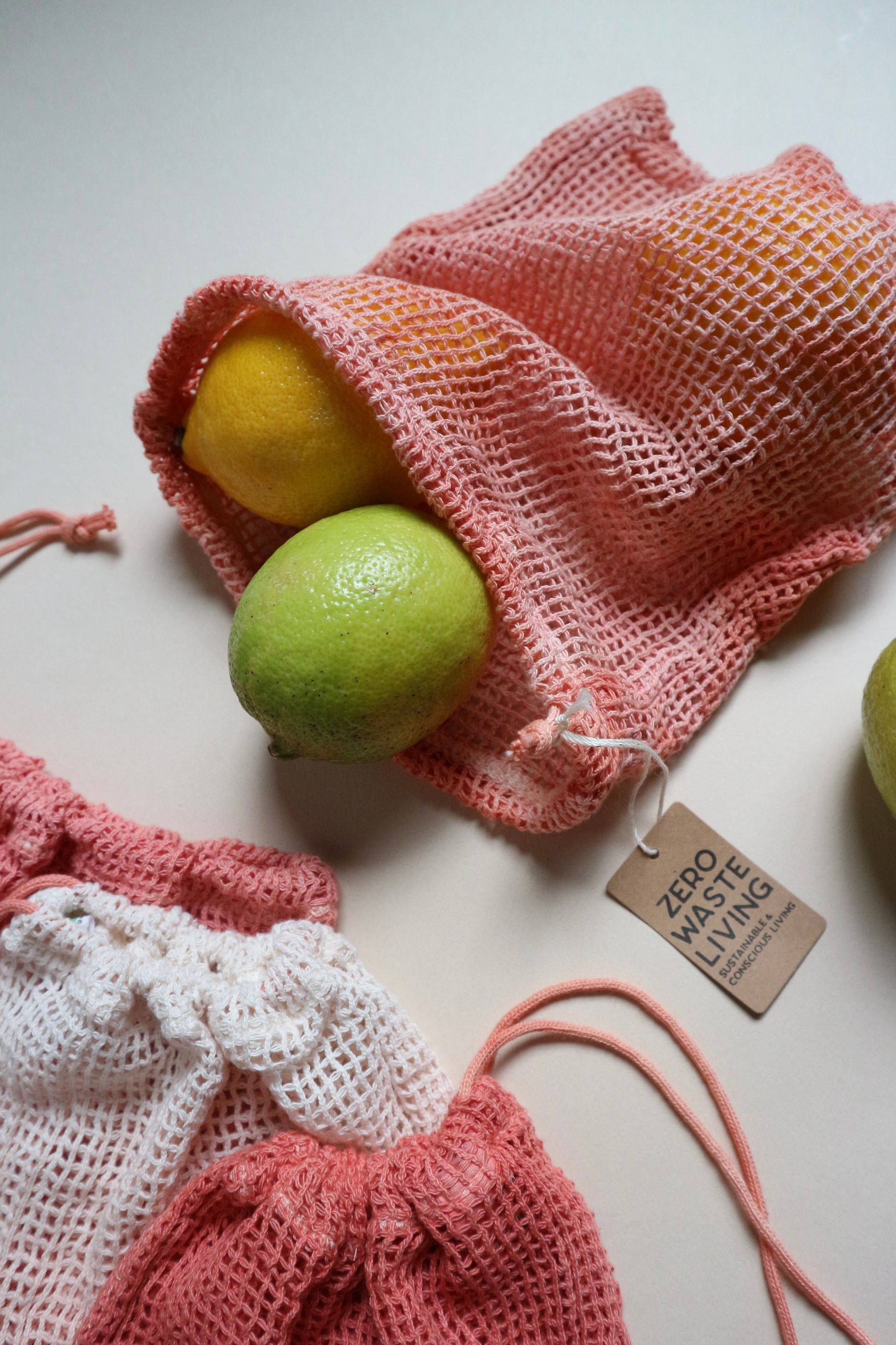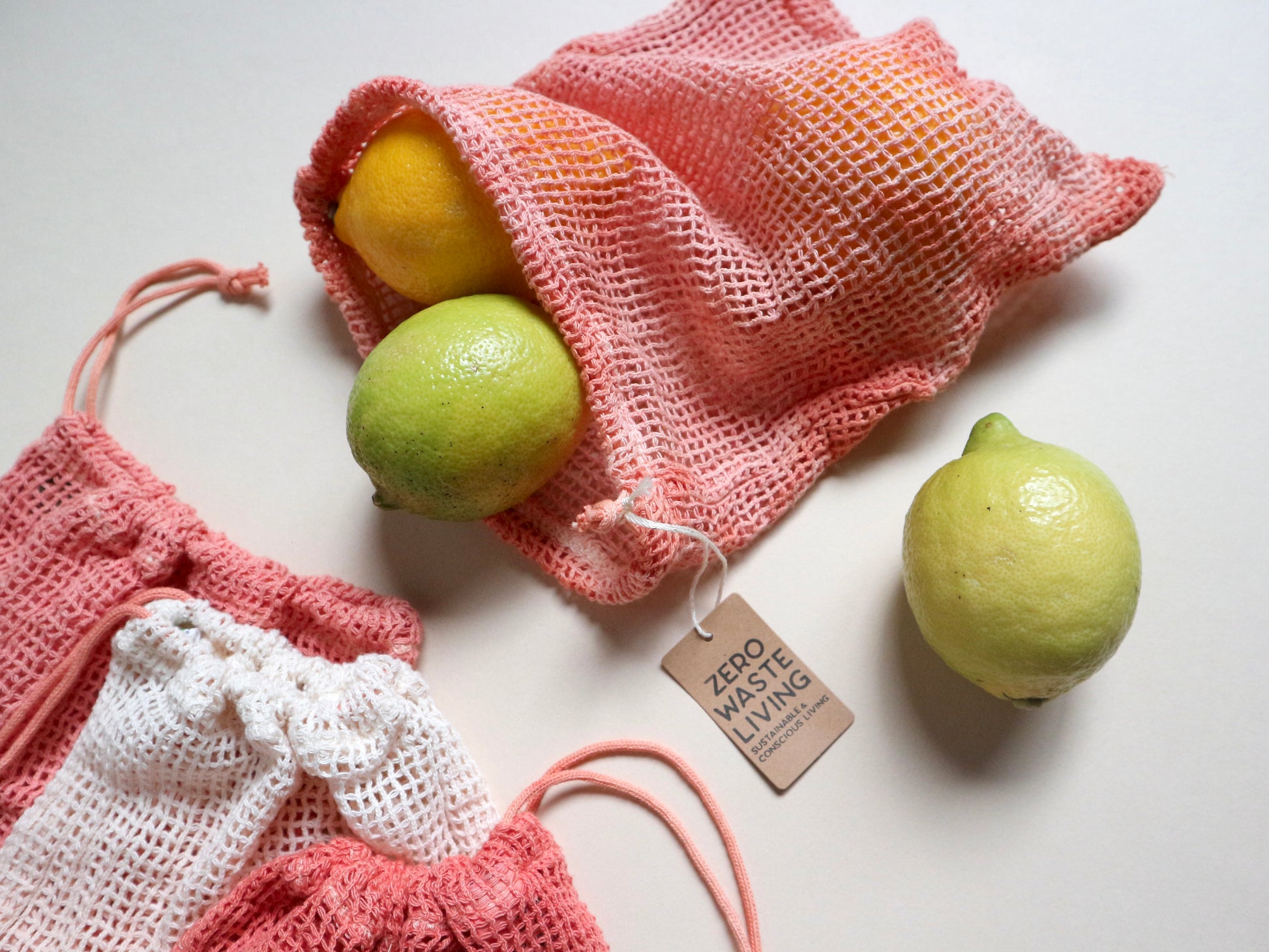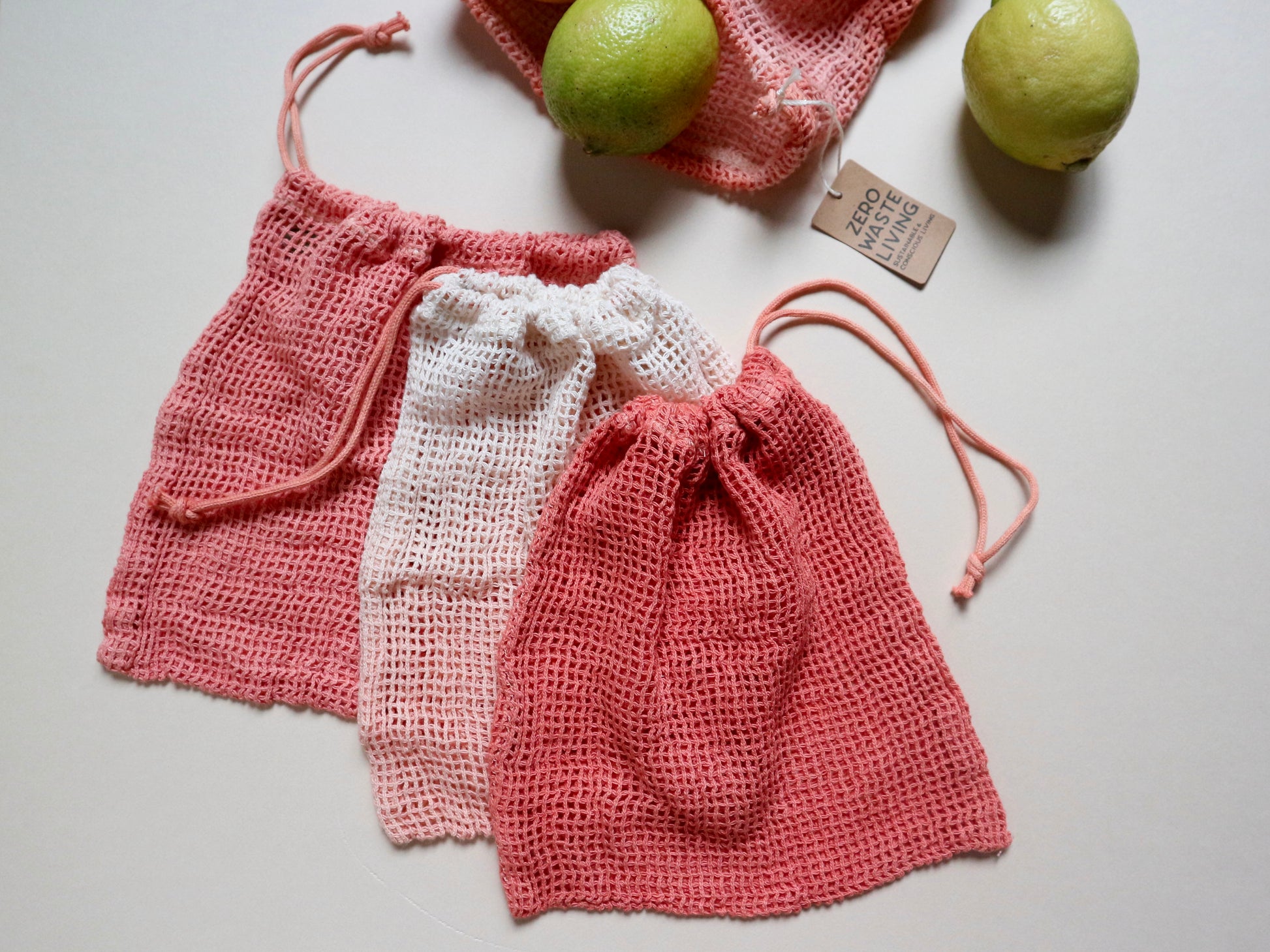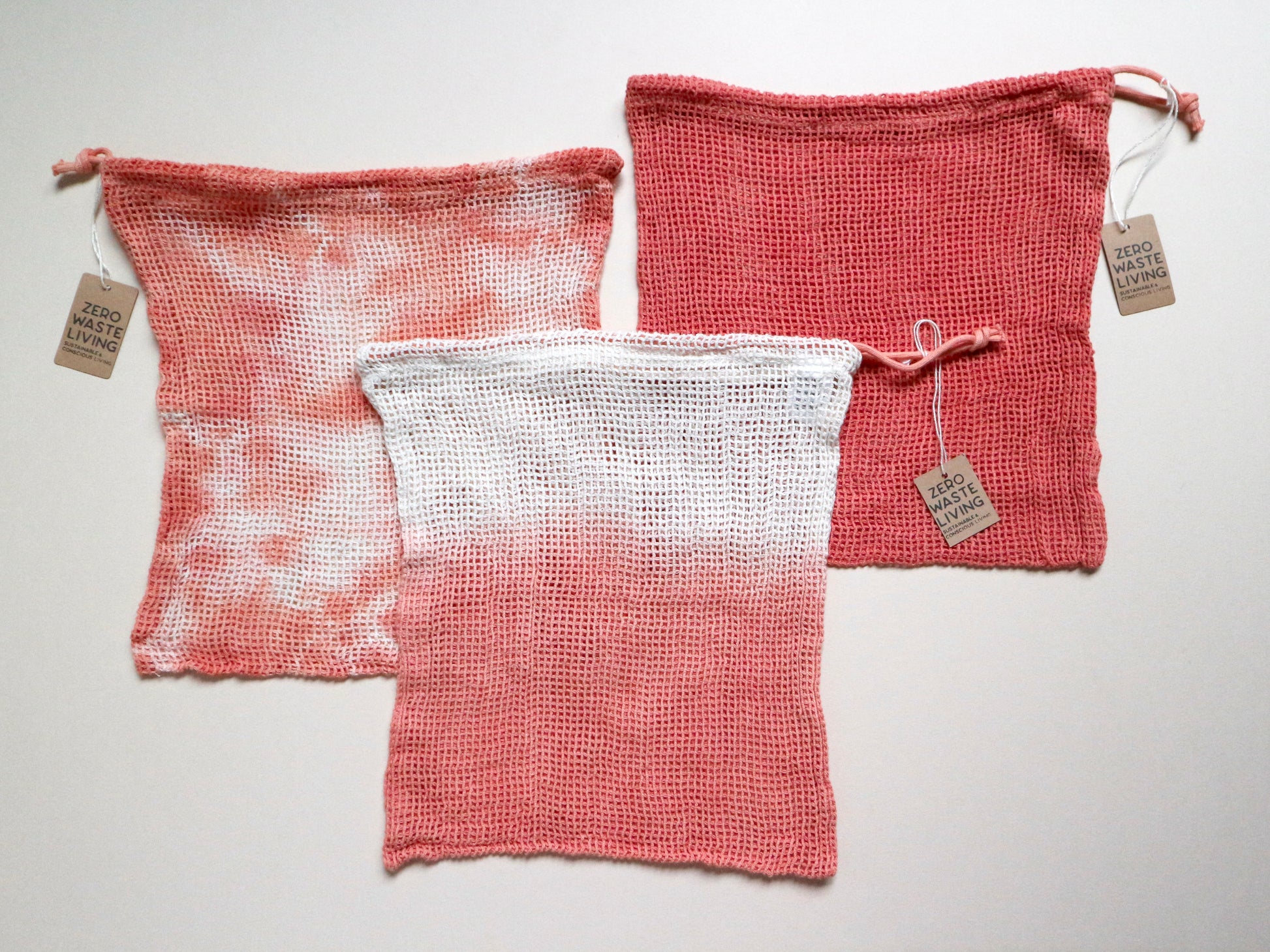 GOTS(オーガニックテキスタイル世界基準)認証のオーガニックコットン100%の野菜が長持ちするメッシュバッグに、草木染めで”大地の色合い”を染め写しました。